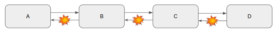 In Microservice architecture, when there are multiple services (A, B, C & D), one service (A) might depend on the other service (B) which in turn might depend on C and so on. Sometimes due to some issue, Service D might not respond as expected. Service D might have thrown some exception like OutOfMemory Error or Internal Server Error. Such exceptions are cascaded to the downstream services which might result in poor user experience as shown below.