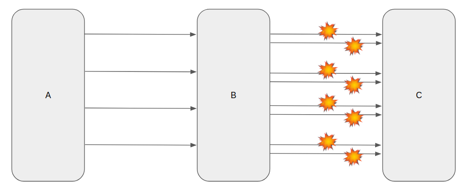 Let’s consider below architecture in which Service B depends on Service C which has an issue. It is not behaving correctly. With this Retry Pattern, Service B will be sending multiple requests again and again to Service C assuming it will work. When there are hundreds of concurrent requests are sent to Service B which in turn would be bombarding Service C with Retry requests!