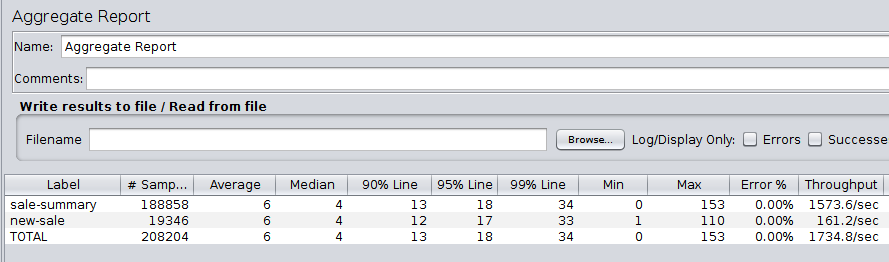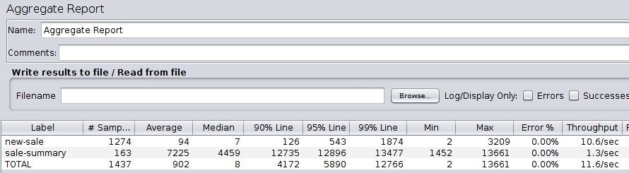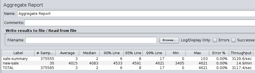 • This time I get exceptionally great result for my sale-summary. As the underlying query is not executed for every GET request, the performance is great! The throughput goes above 3000 requests / second.