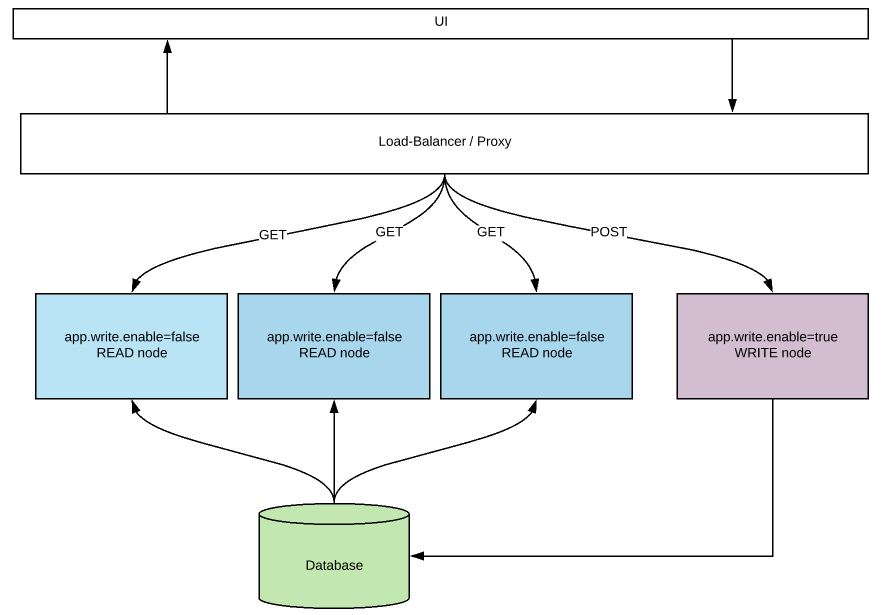 So based on a property, we change if the app is going to behave like a read-only node or write-only node. It gives us the ability to run multiple instances of an app with different modes. I can have 1 instance of my app which does the writing while I can have multiple instances of my app just for serving the read requests. They can be scaled in-out independently. We can place them behind a load balancer / proxy like nginx – so that READ / WRITE requests could be forwarded to appropriate instances using path based routing or some other mechanism.