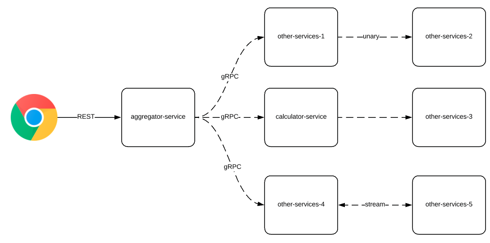 When we have multiple services, 1 service would act like an aggregator service which is responsible for orchestrating the request and make internal calls to other microservices and consolidate the responses and send back to the client. The aggregator service when it calls other microservices uses gRPC. The communication between front-end and aggregator will be REST. (We can also use gRPC-Web.)