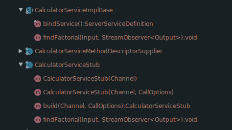 For example, CalculatorServiceImplBase class in the below picture is auto-generated abstract class which needs to be implemented by the server for the above service definition. Similarly CalculatorServiceStub is the actual implementation class which client should use to make a request.