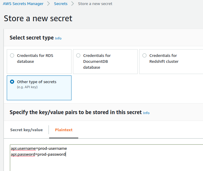- I set up some credentials in the AWS secrets manager as shown below.