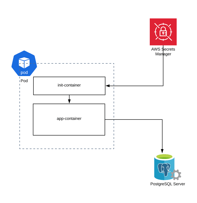 - The main purpose of the init container in our case is to access the secrets manager using the aws-cli and store the credentials in a location.