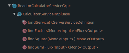 ReactorCalculatorServiceGrpc class in the below picture is auto-generated abstract class which needs to be implemented by the server for the above service definition. If you notice the method signature, it uses Flux / Mono Instead of StreamObserver.