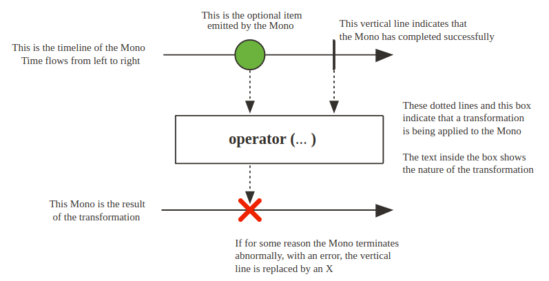 Mono is an another implementation of Publisher. It emits at most one item and then (optionally) terminates with an onComplete signal or an onError signal.. (Image courtesy: project reactor site). Like Flux, Mono is also asynchronous in nature.